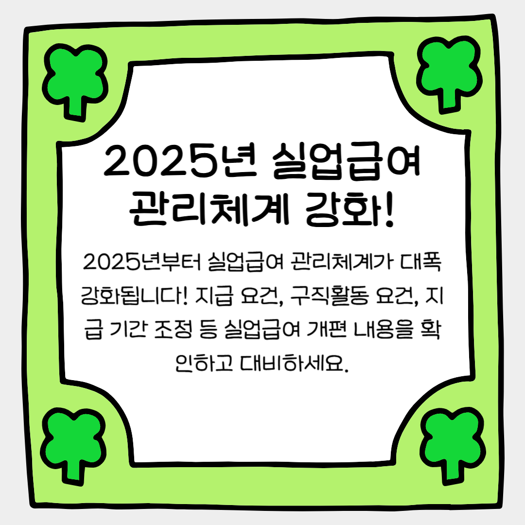 2025년부터 실업급여 관리체계가 대폭 강화됩니다! 지급 요건, 구직활동 요건, 지급 기간 조정 등 실업급여 개편 내용을 확인하고 대비하세요.