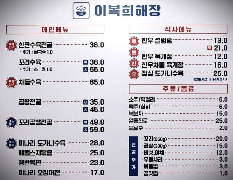 이복희해장의 메뉴는 단순한 해장국이 아닙니다. 고품질 한우를 사용한 국물 요리와 안주 메뉴가 다양하게 준비되어 있어서 점심엔 해장국, 저녁엔 술자리로 활용하기 딱 좋습니다.